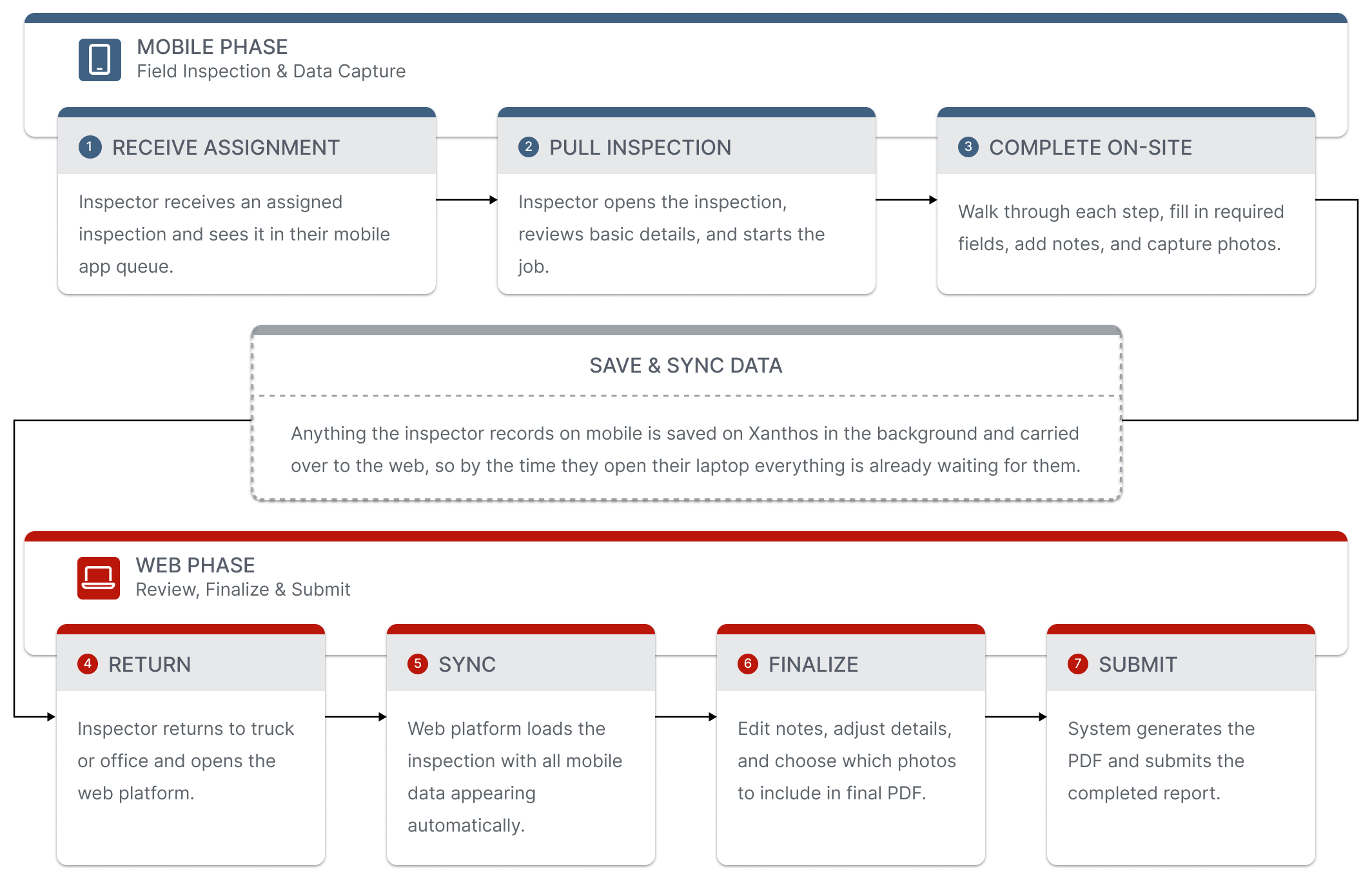 This user flow outlines the full inspection journey from mobile to web. It shows how inspectors start the workflow in the field, then pick up right where they left off on their laptop, with all notes and photos already synced in. It highlights the handoff between devices and how the final report moves smoothly into Xanthos once everything is reviewed.