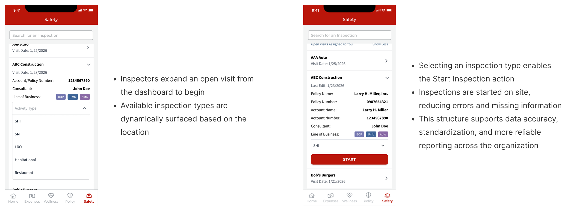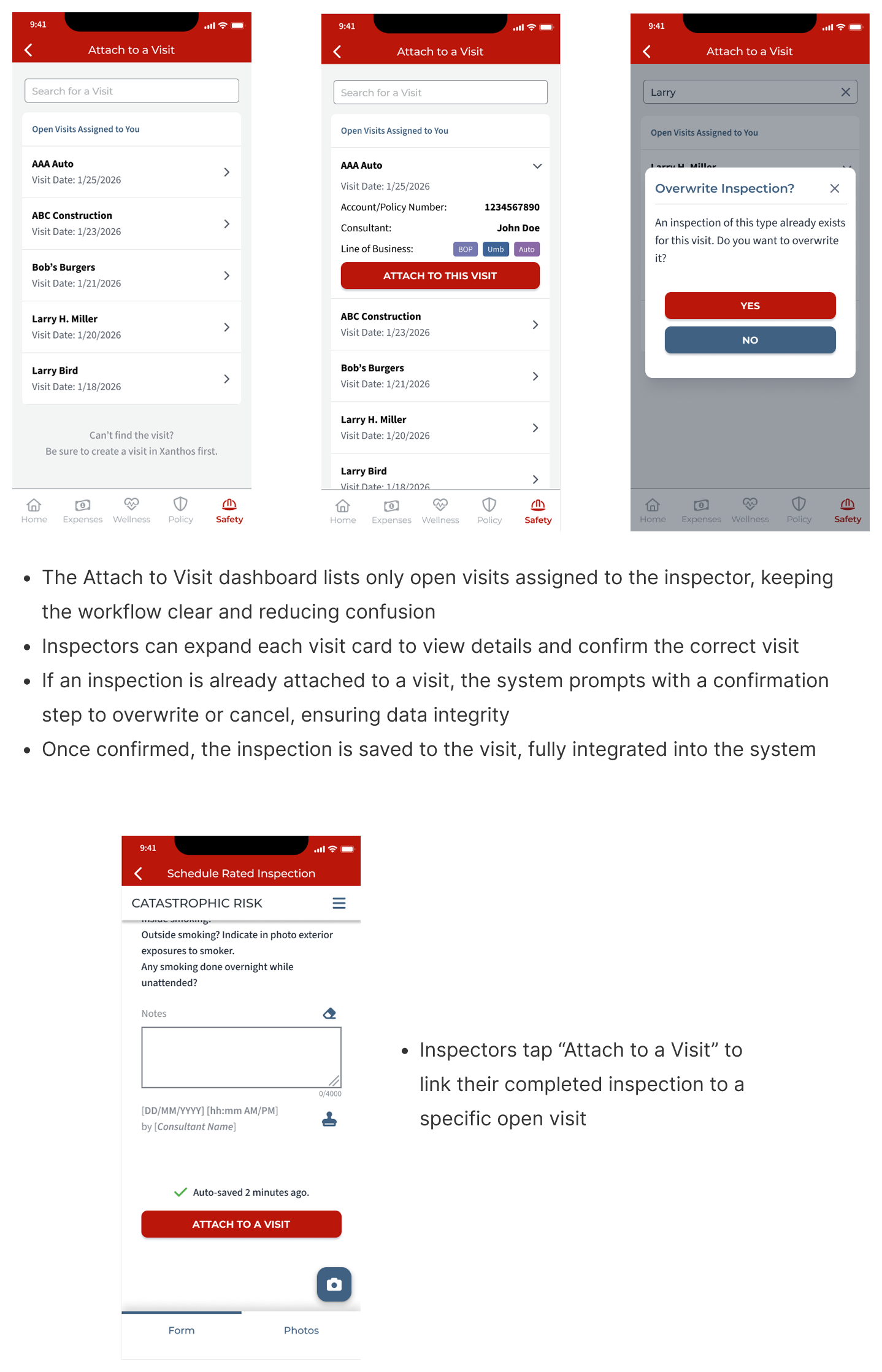 We talked with two Safety Consultants, Evan and Marcus, to learn how they handle assignments, prepare for visits, collect data on site, and put together their reports. Their insights helped us understand pain points and informed our design for a smoother, end-to-end inspection experience.