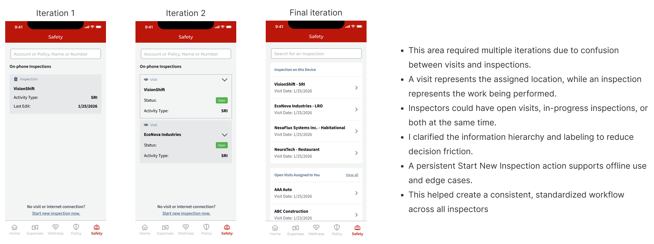 Walking through the flow screen by screen gave everyone clearer context behind key decisions. When safety inspectors joined, the full flow helped surface gaps or compliance concerns we might have missed. With the BA, PM, developers, and users all involved, we could validate scenarios in real time and refine the designs more efficiently.